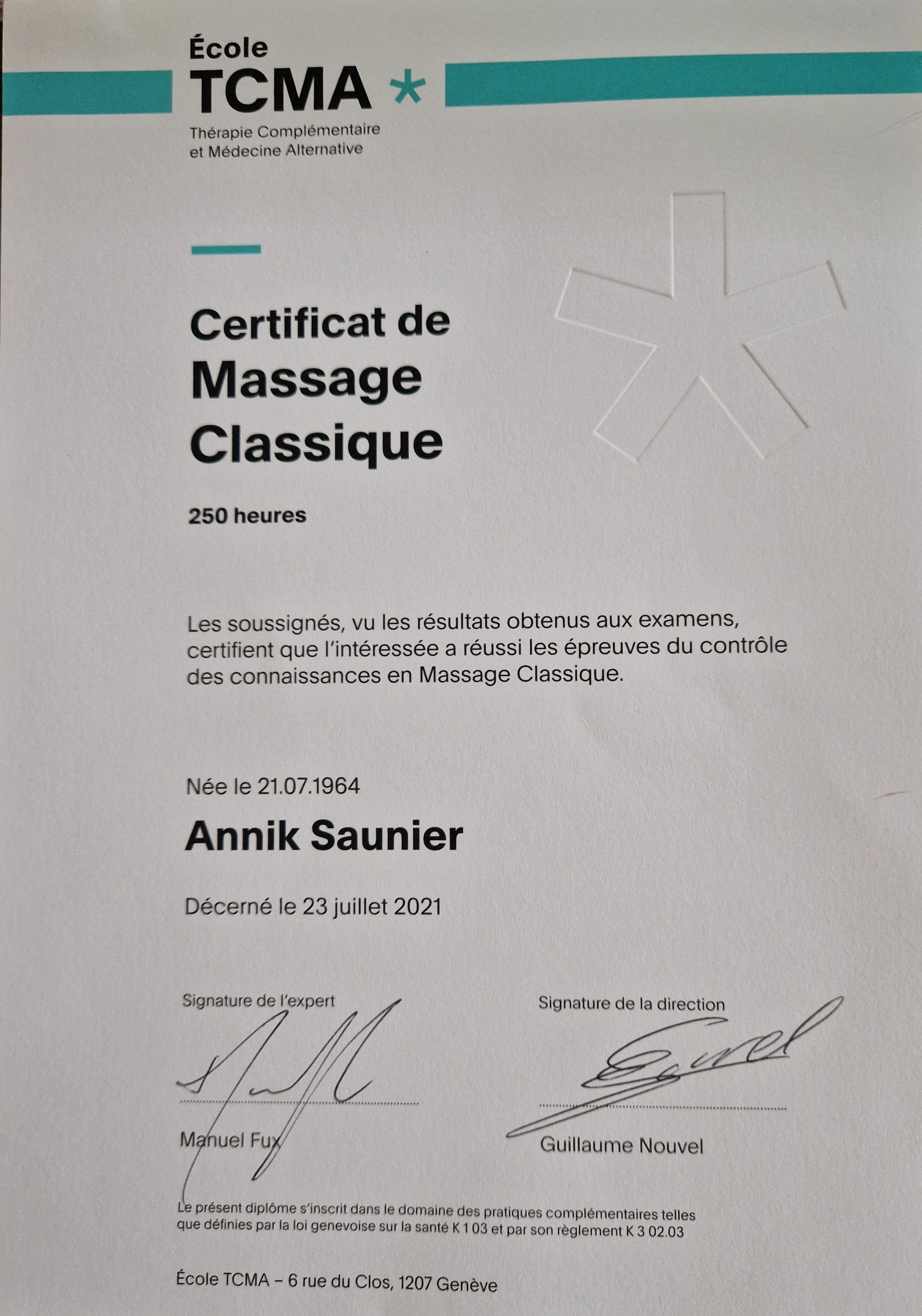 - Praticienne en massage thérapeutique classique (diplômée de l'Ecole TCMA à Genève depuis 2021)