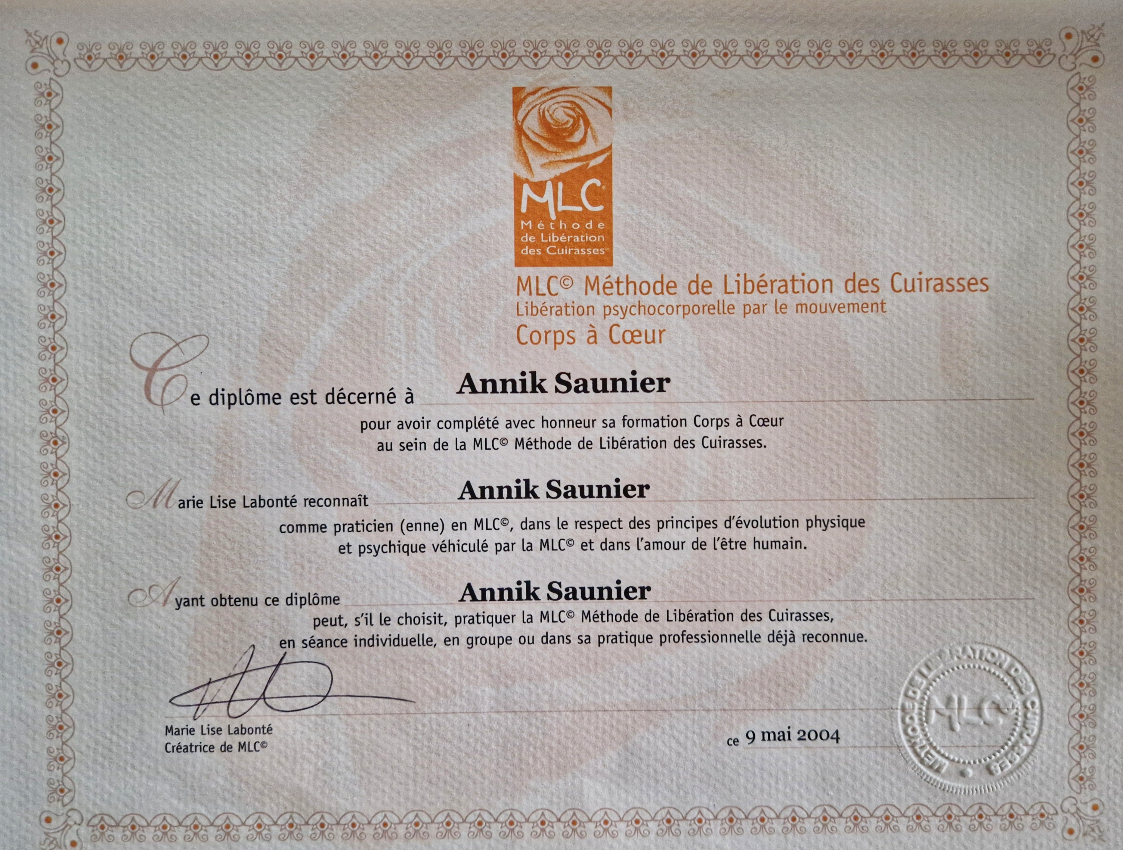 - Praticienne en MLC(c), mouvements d'éveil corporel (formée par Marie Lise Labonté et son équipe de thérapeutes, diplômée depuis 2004)